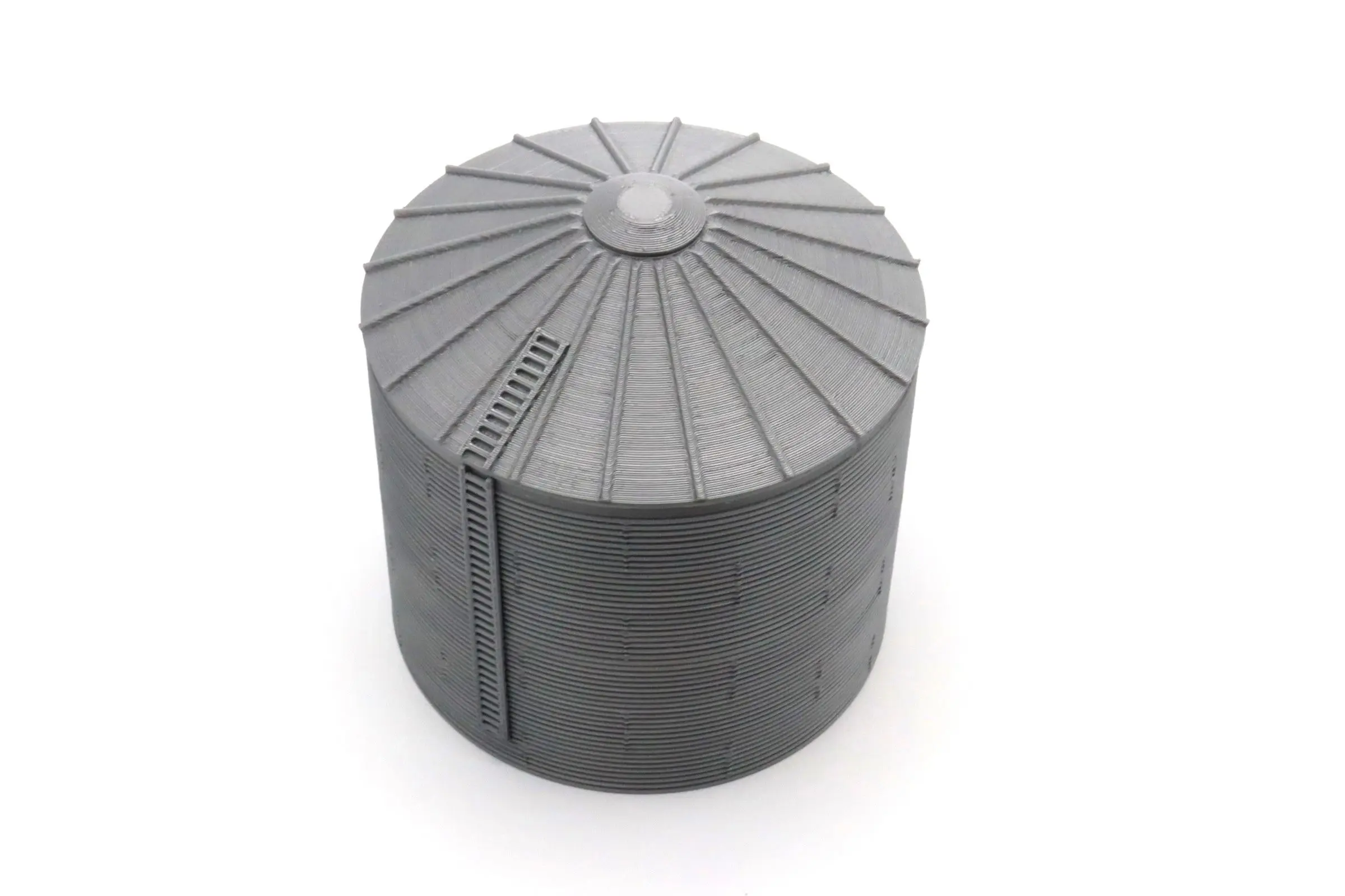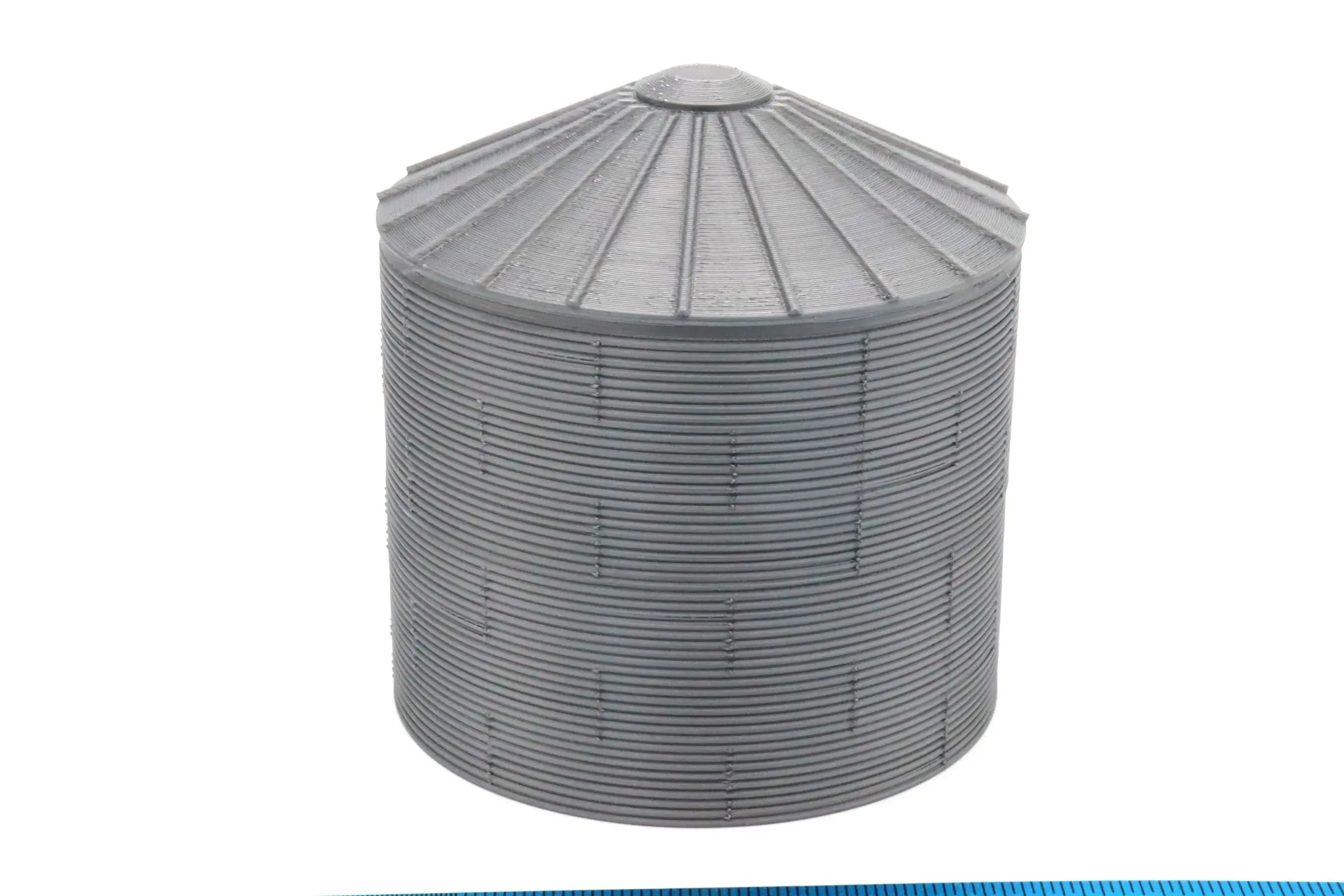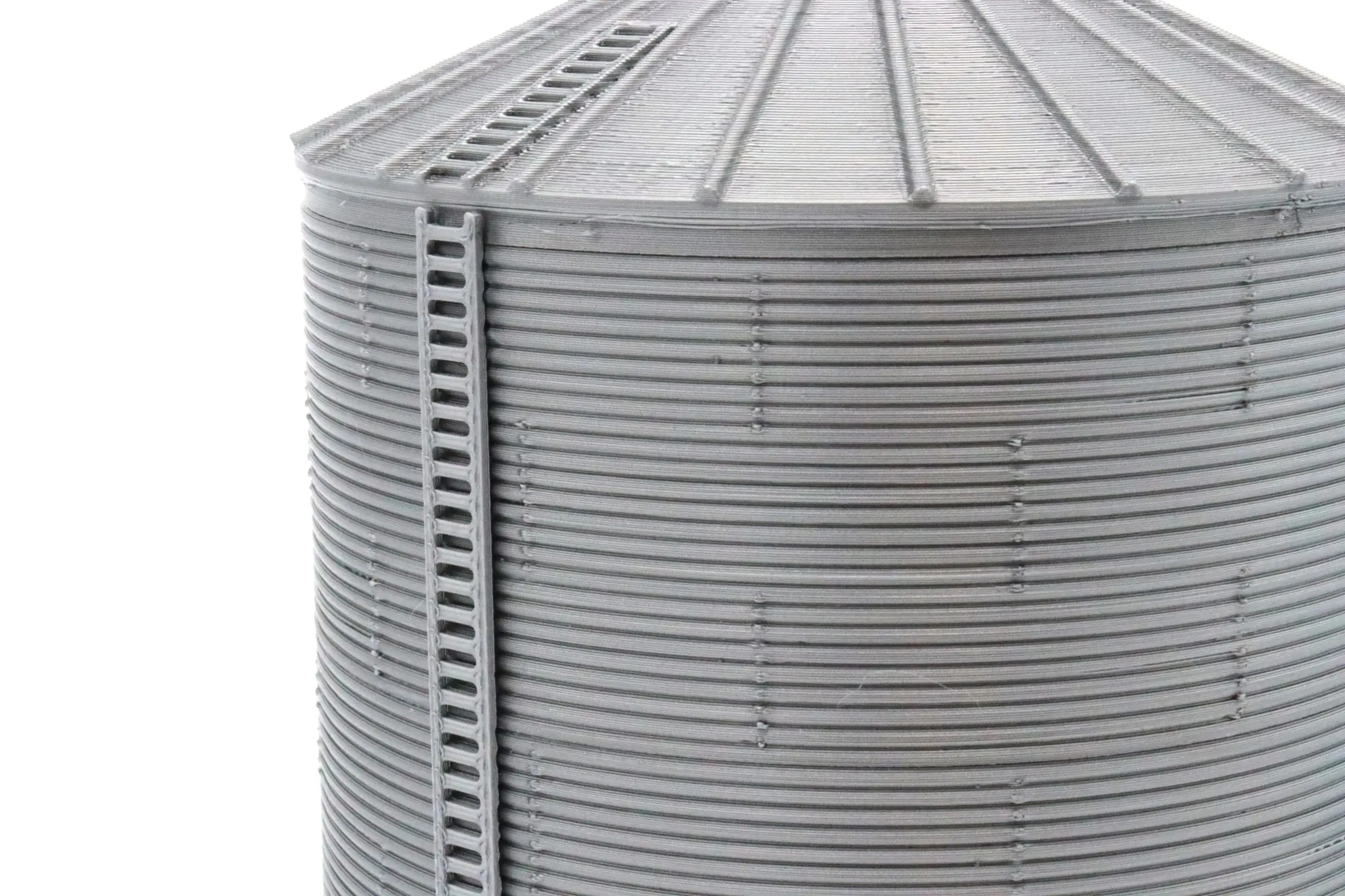 This grain bin is a 64th scale representation of a 24’ diameter grain bin, capable of holding 28,000 bushels of grain.