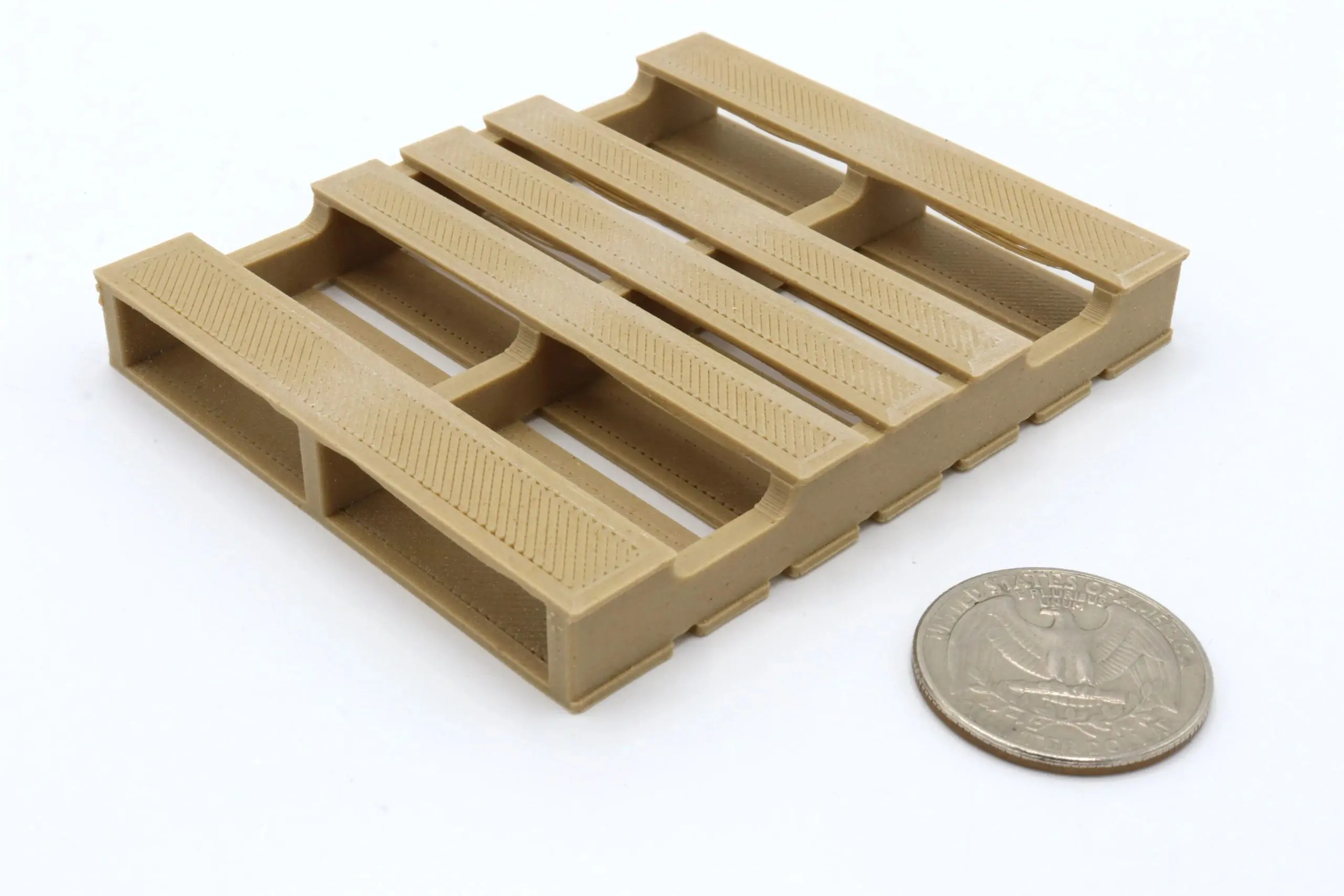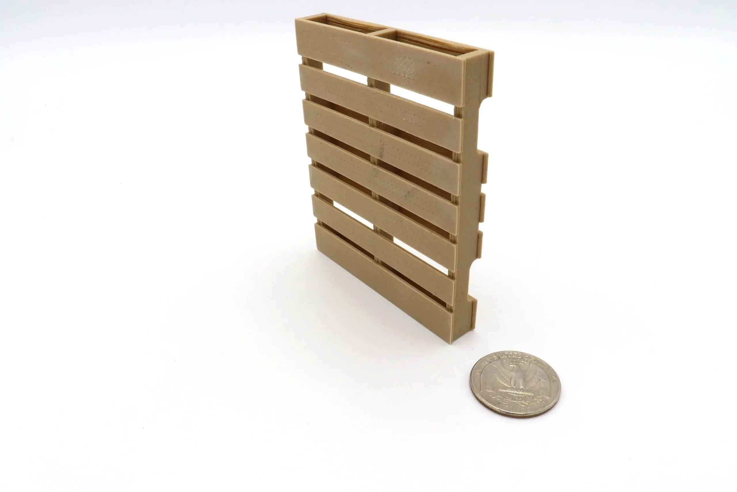 These pallets are hand assembled to ensure the highest quality outcome. They are made of a wood based, 3D printable filament, meaning they can be lightly stained to give the product age!