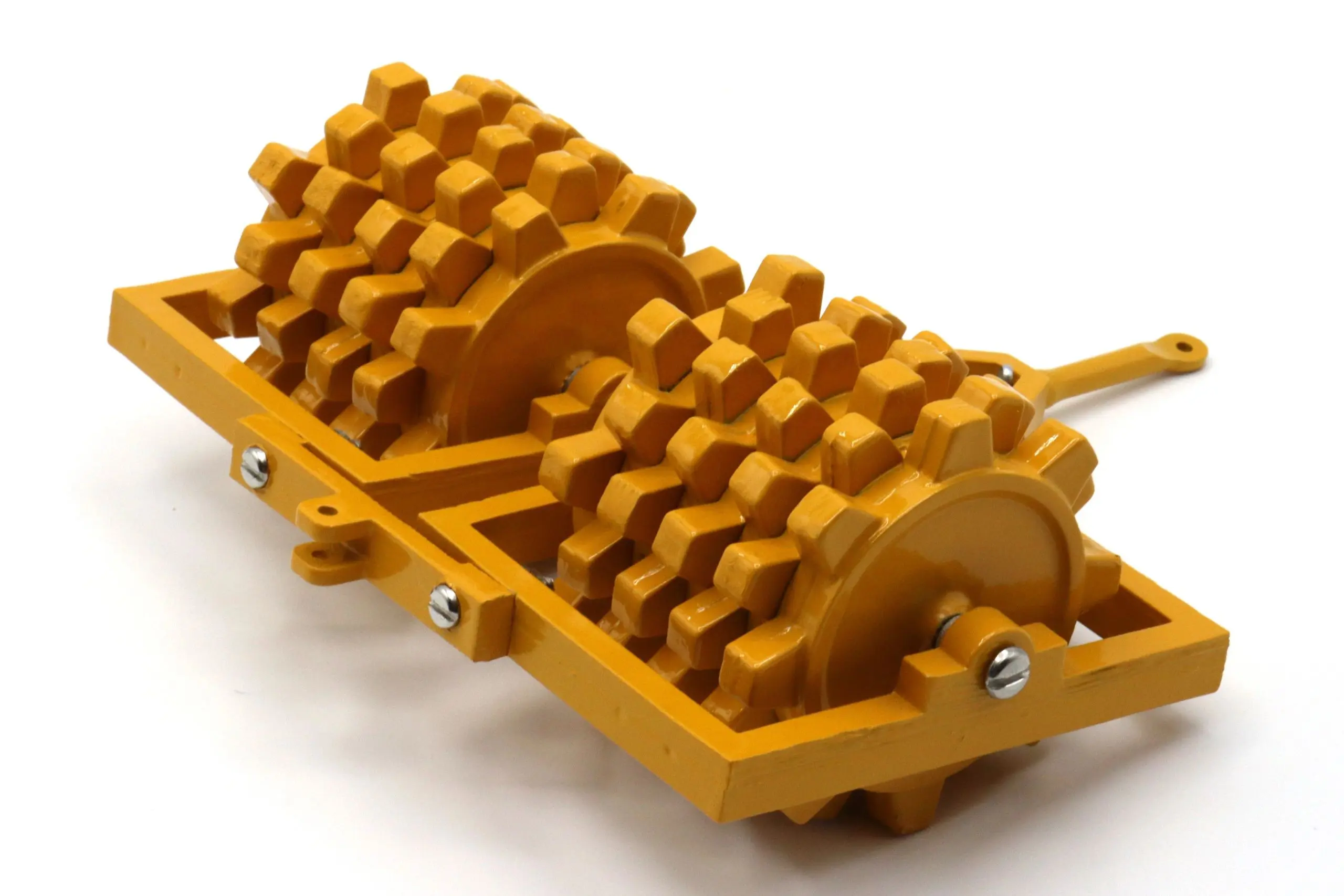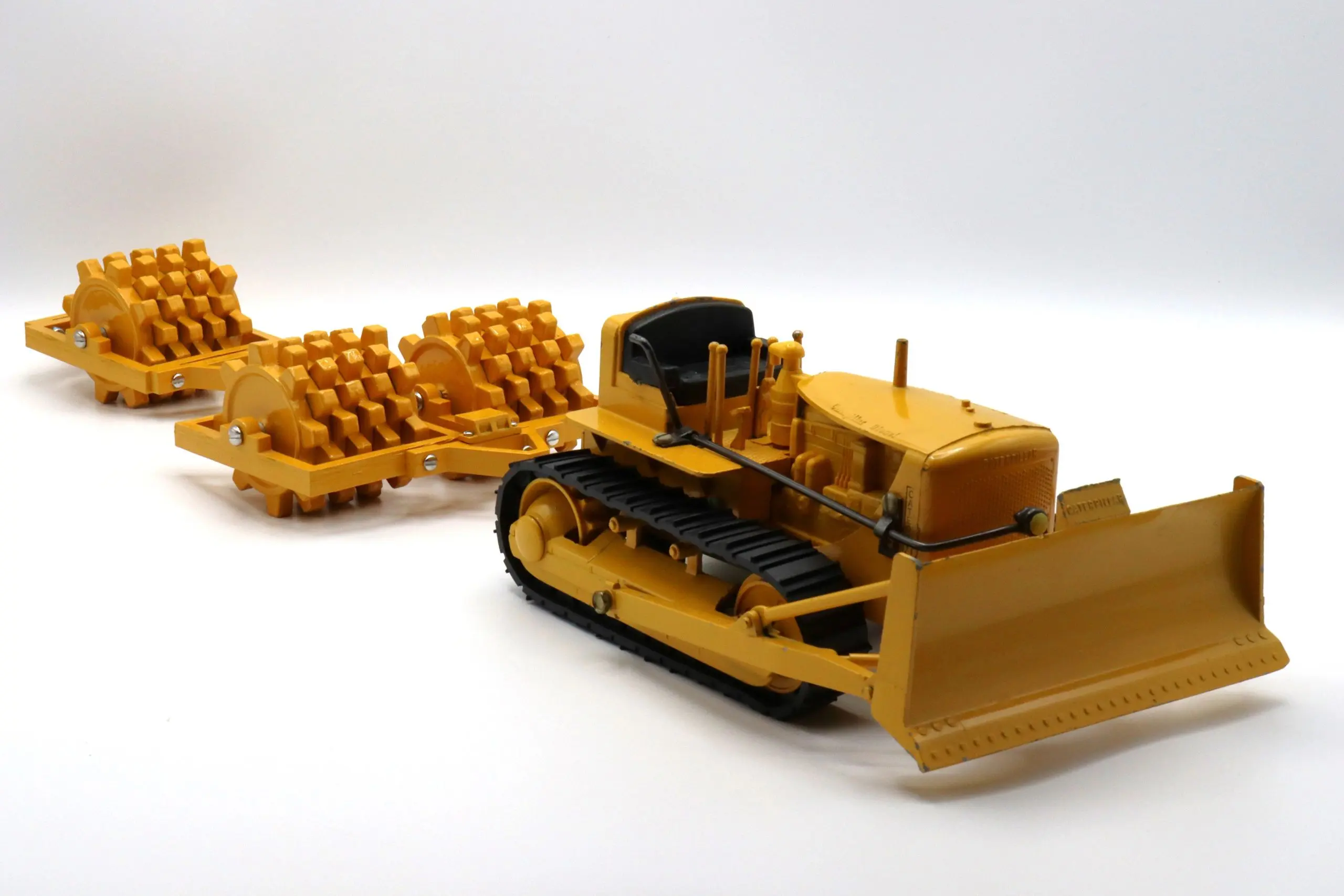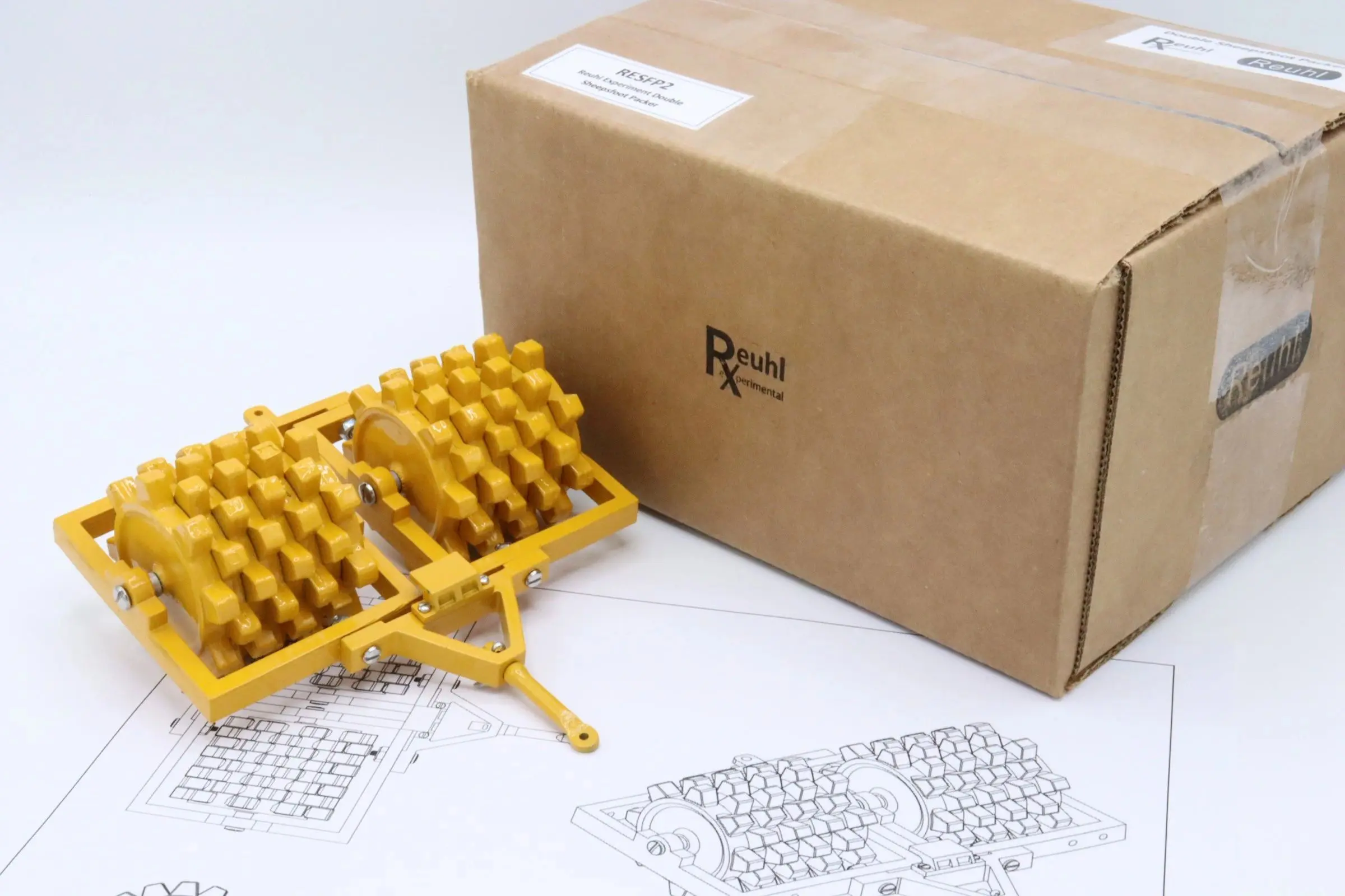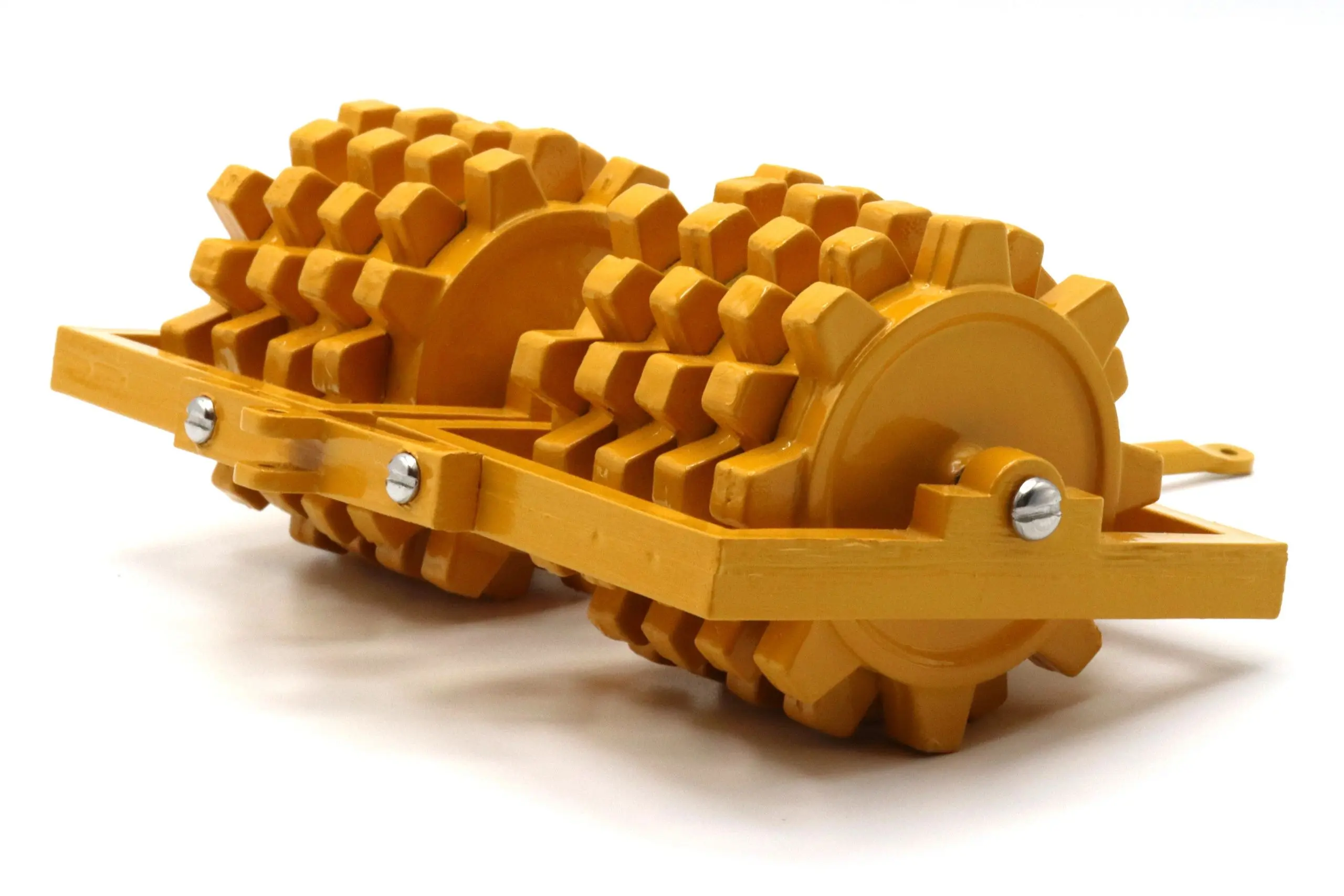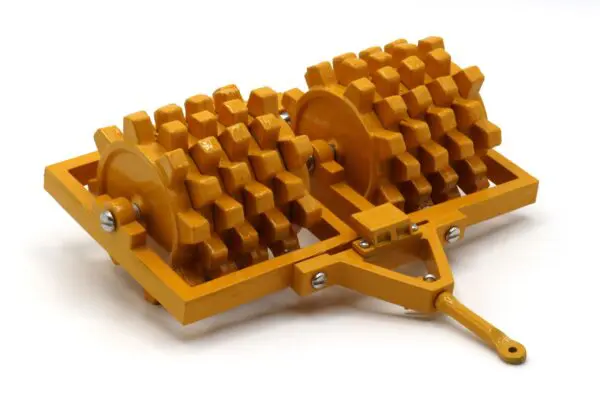 The Double Sheepsfoot Packer pictured is a part of the Reuhl Experimental line produced in 2022. Approximately 10 of these prototype models have been produced by Reuhl Products. These packers are a very heavy zinc cast construction painted in the traditional Caterpillar yellow of the 1950s. The Reuhl Experimental Double Sheepsfoot Packer consists of 22 zinc cast parts, 10 screws, and 11 other pieces of hardware.