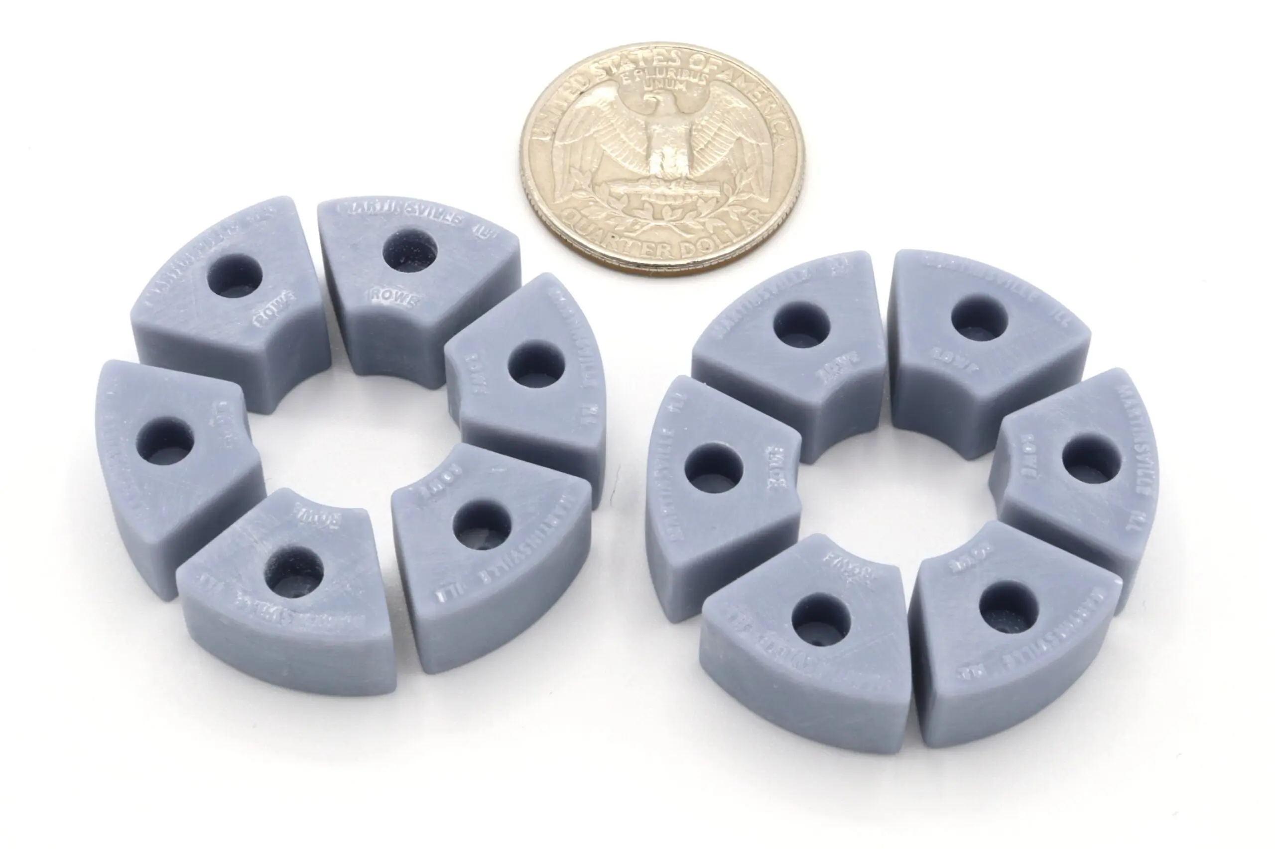 For sale is two wheels worth of weights designed in 1:16th scale. These weights are designed as 12 (6 per wheel) individual weights that represent the full sized 75 lb. weights with “MARTINSVILLE ILL” and “ROWE” embossed on each pie piece. (Allis Chalmers D19, D20, 190, 190XT)