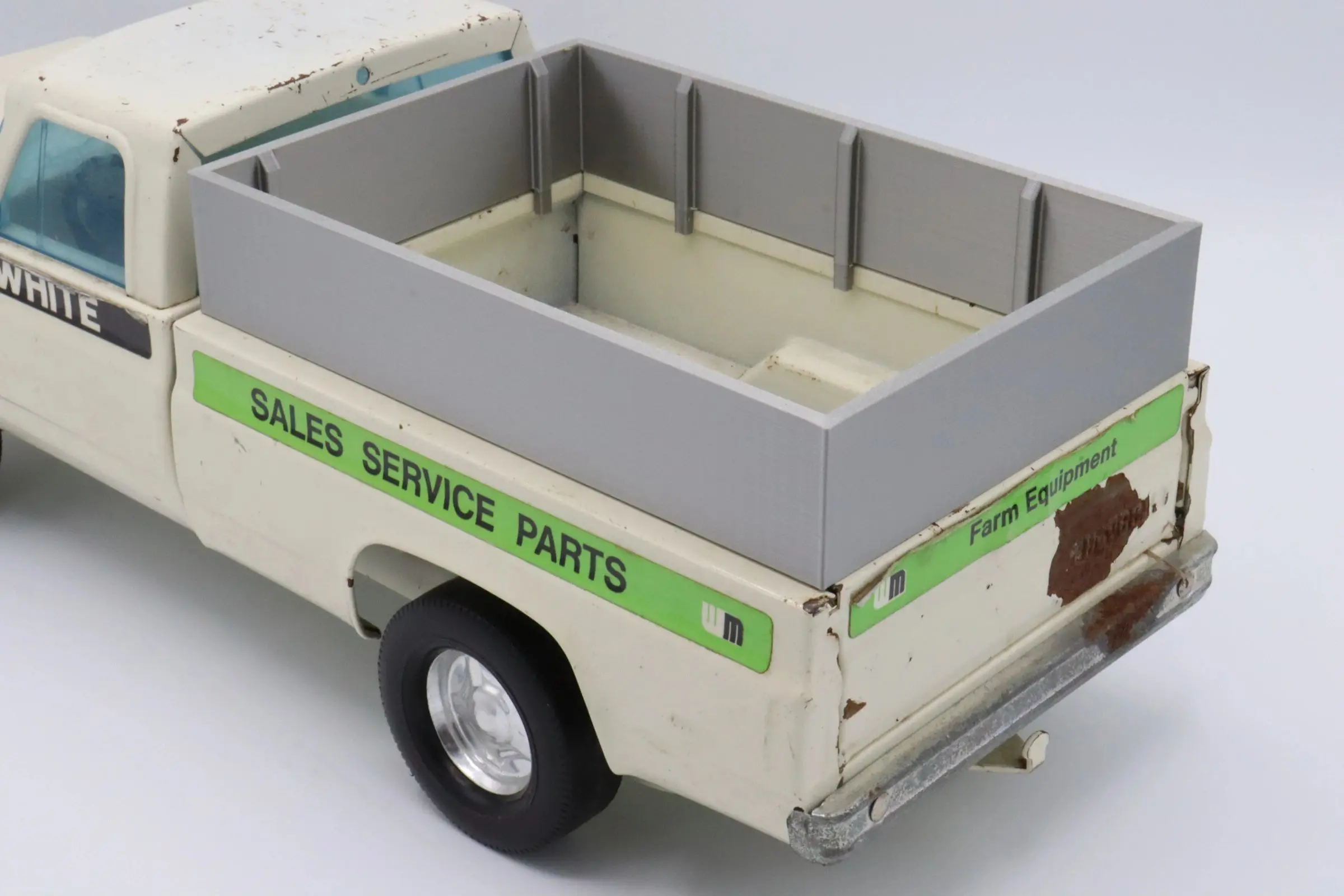 This item is a 3D printed box extension made for the Nylint truck shown in the pictures. The extension is a bright silver meant to replicate materials commonly found on farm trucks of the era.