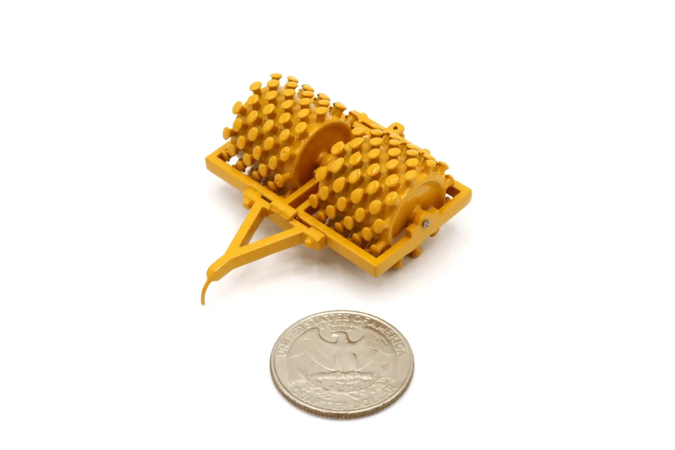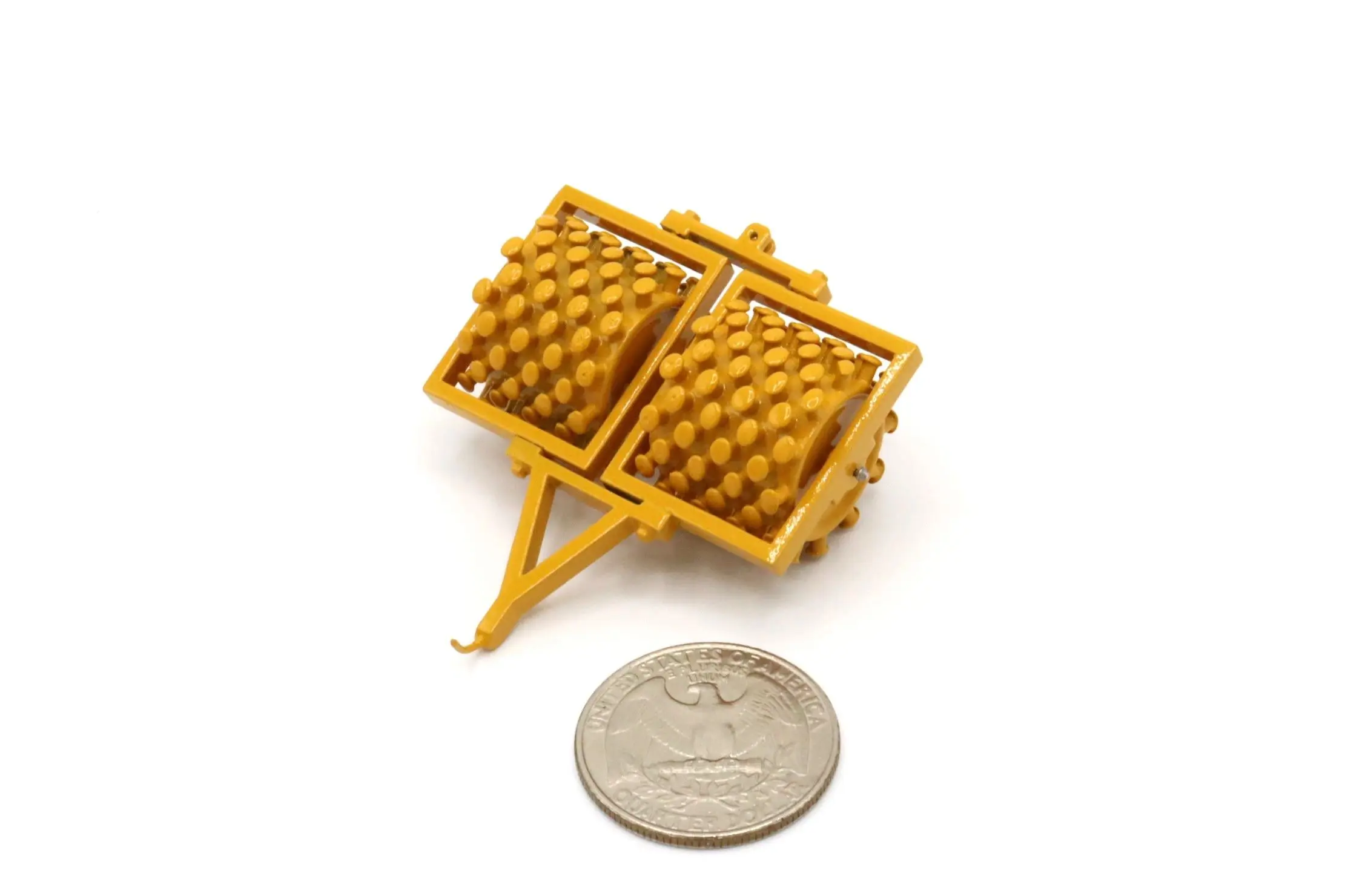 The packer is made of resin components that are fixed together and painted forming a single unit. The pins used to attach the rollers do allow the packer to roll! This packer is painted using old Caterpillar yellow (also known as Hi-Way Yellow), which was used from 1931-1979.