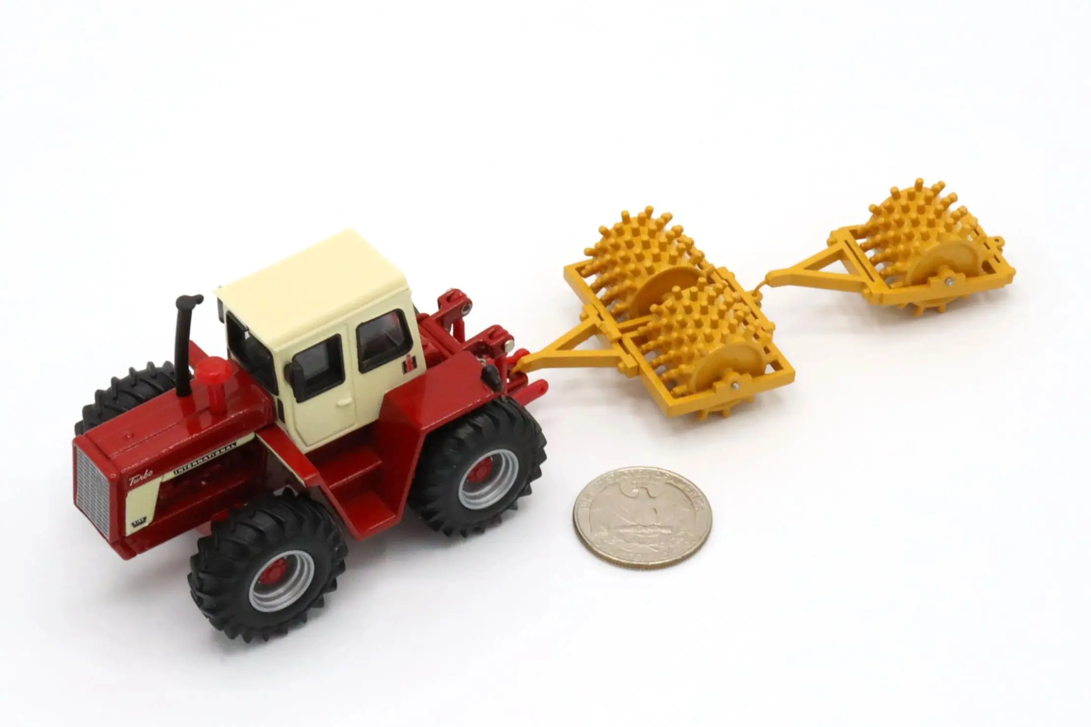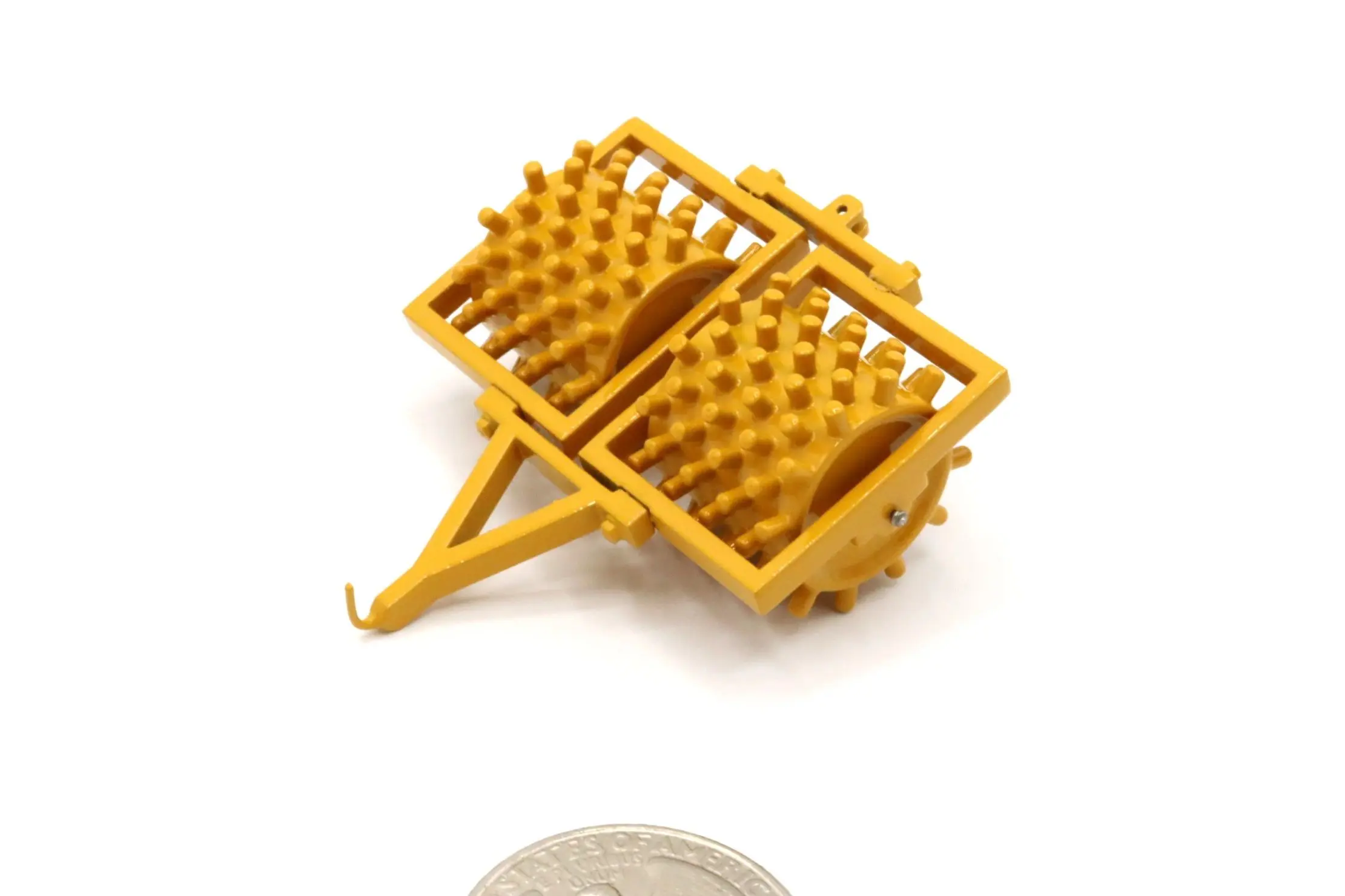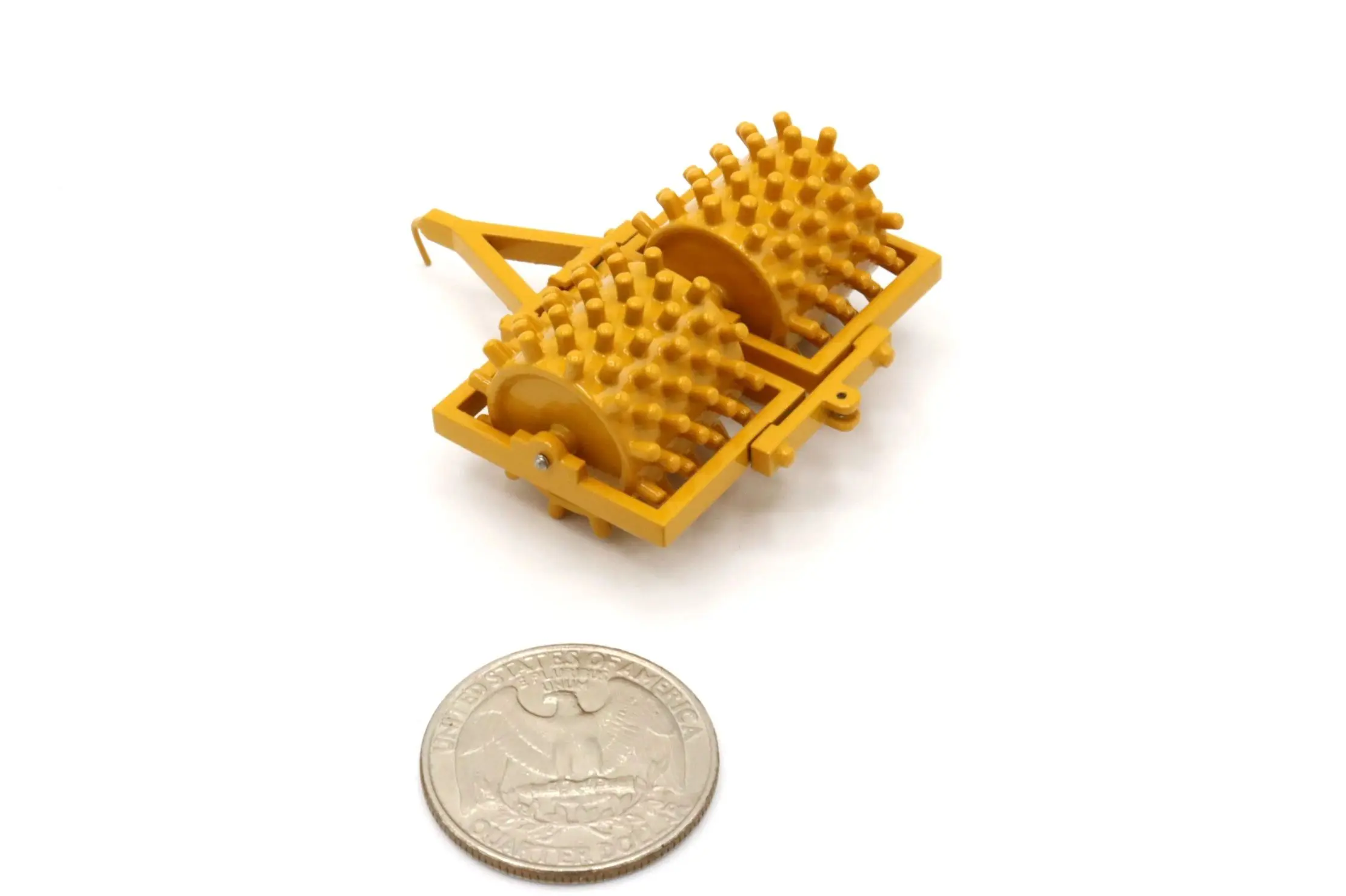 The packer is made of resin components that are fixed together and painted forming a single unit. The pins used to attach the rollers do allow the packer to roll! This packer is painted using old Caterpillar yellow (also known as Hi-Way Yellow), which was used from 1931-1979.