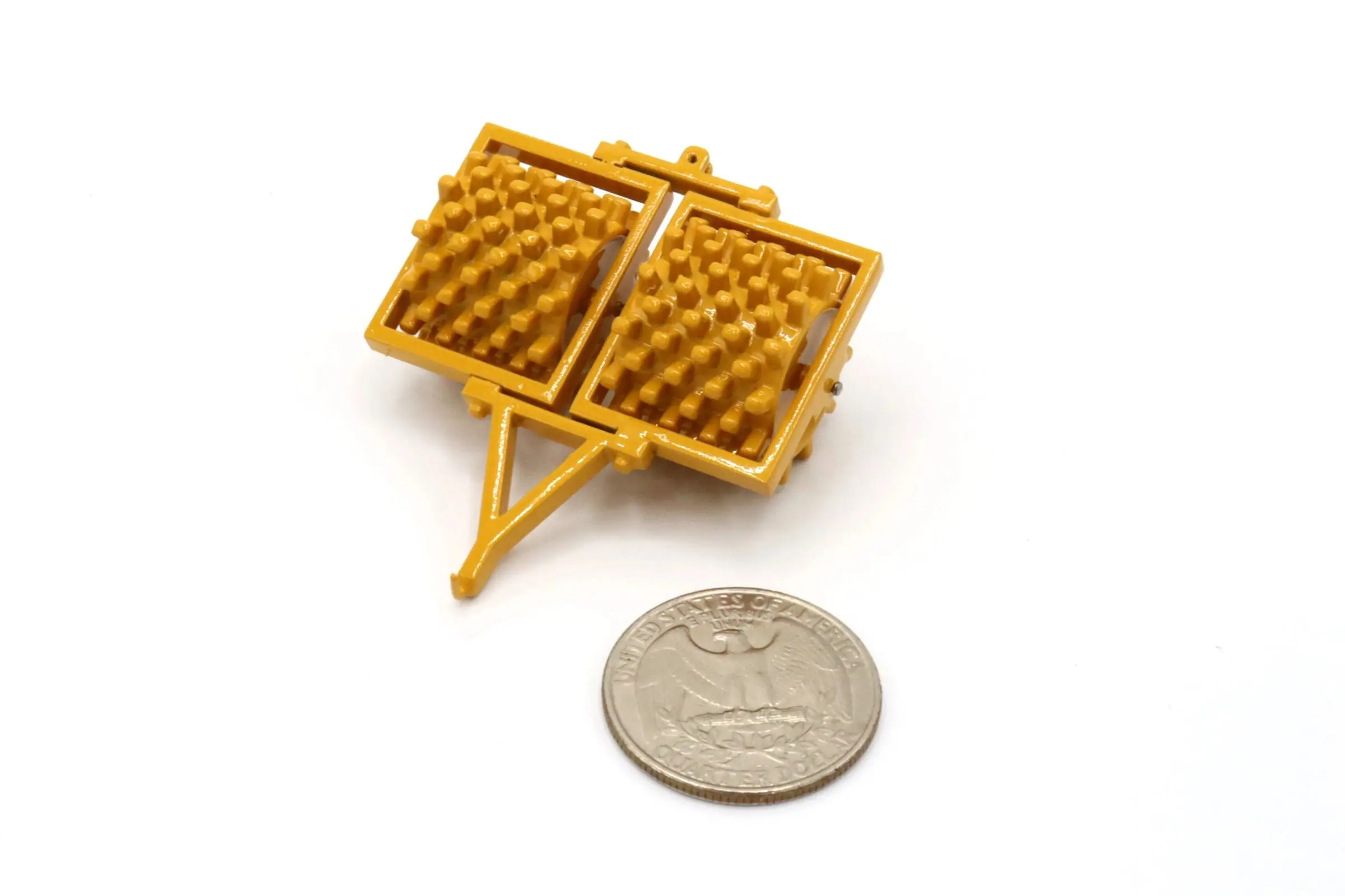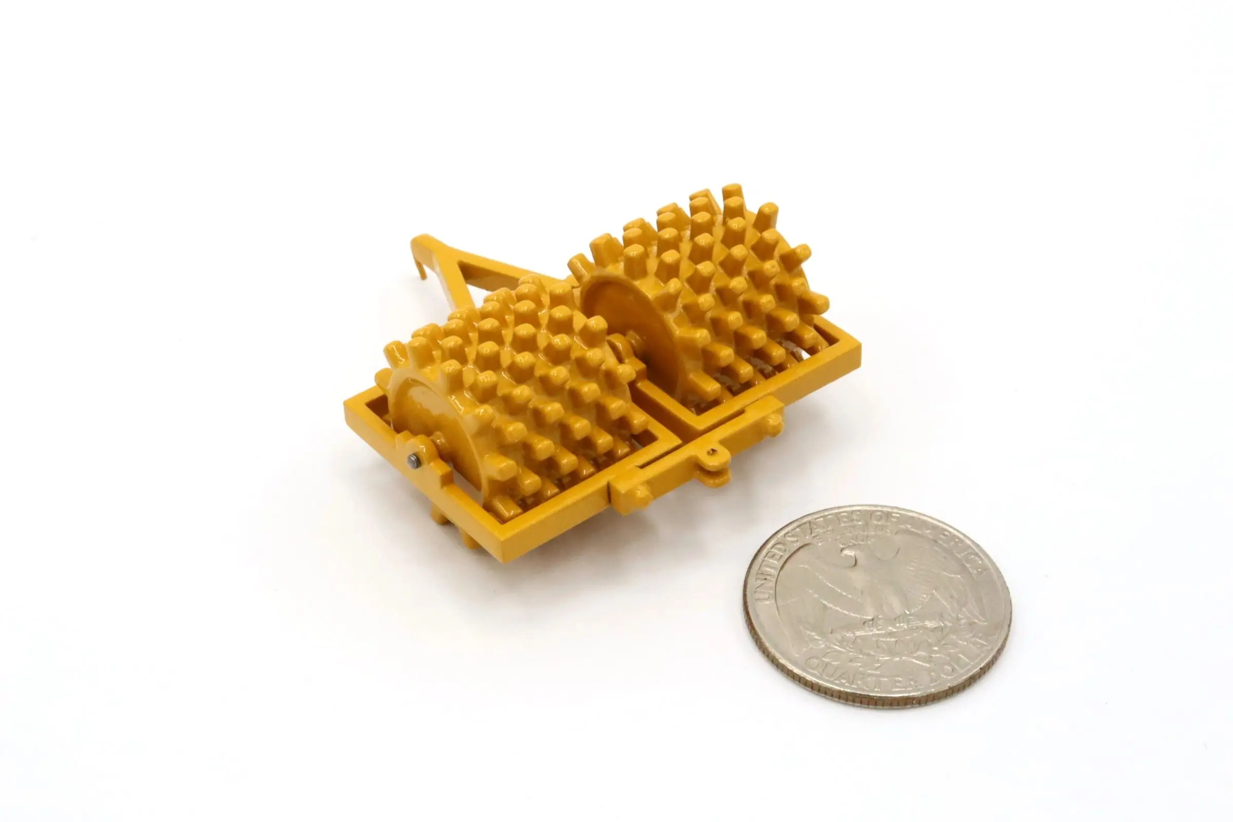 The packer is made of resin components that are fixed together and painted forming a single unit. The pins used to attach the rollers do allow the packer to roll! This packer is painted using old Caterpillar yellow (also known as Hi-Way Yellow), which was used from 1931-1979.