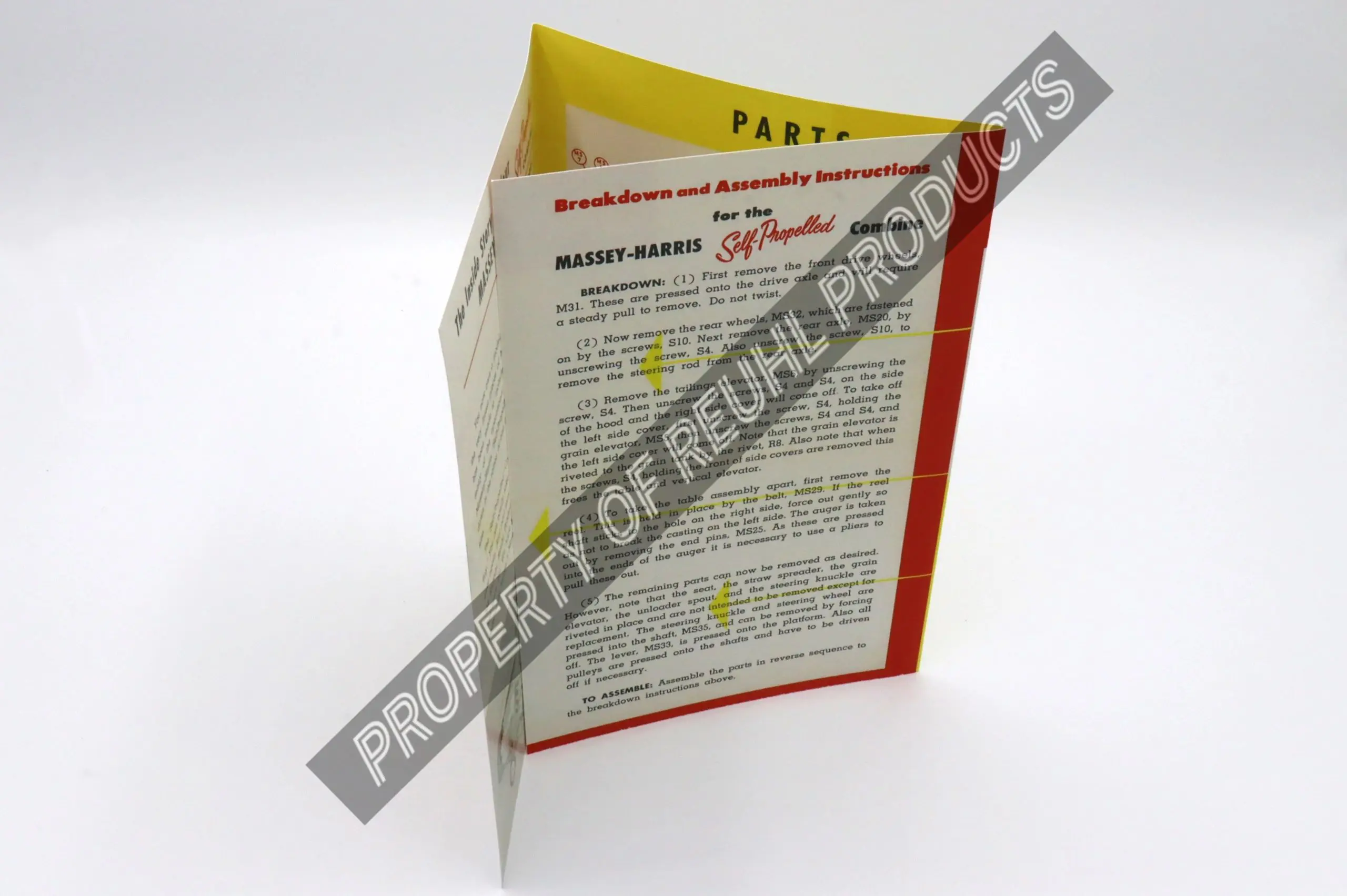 This item is an official Reuhl reprinted Breakdown and Assembly Instructions insert for the Self-Propelled Combine that would have originally accompanied the toy from the factory. The instructions sheet includes detailed instructions on disassembly and reassembly as well as a list of parts and their original replacement price.