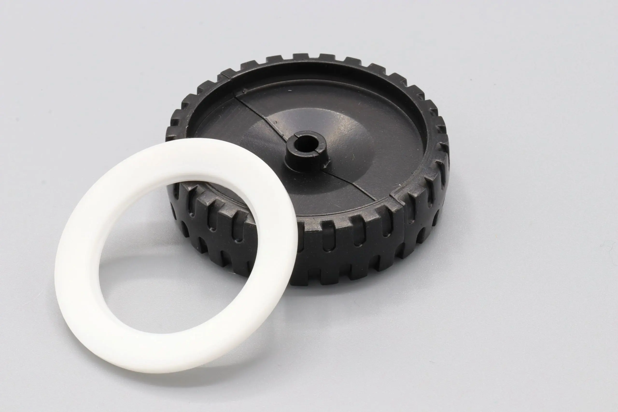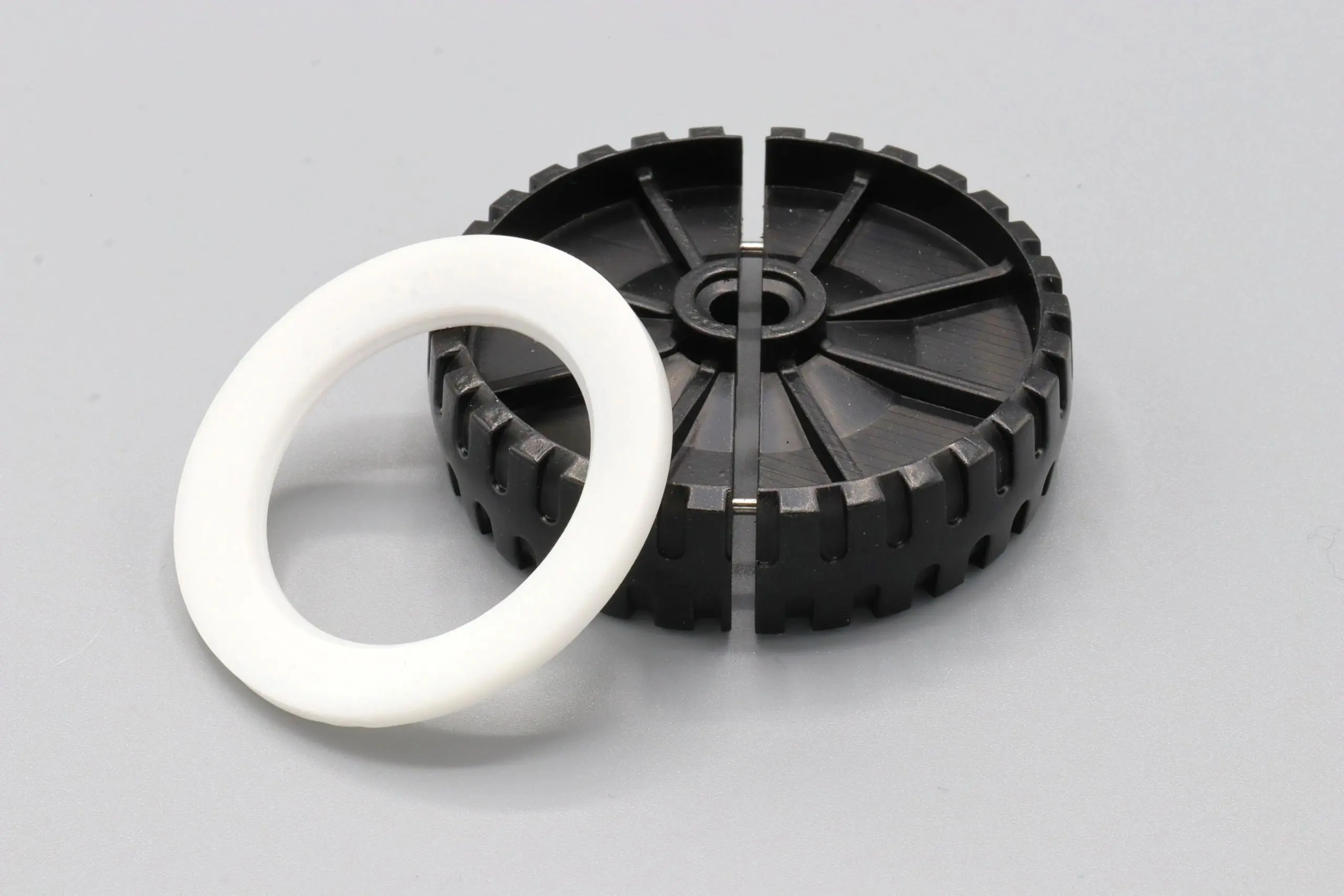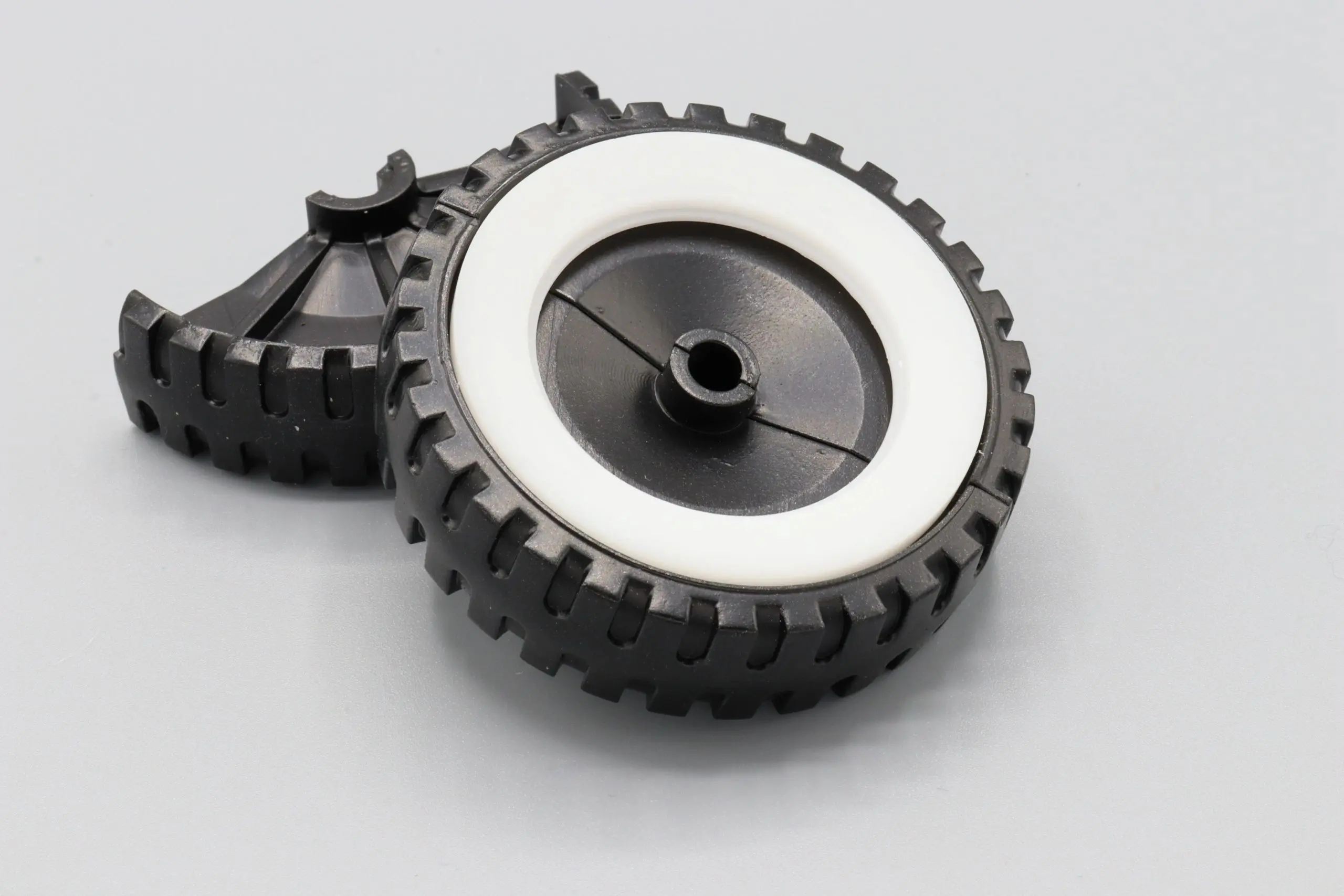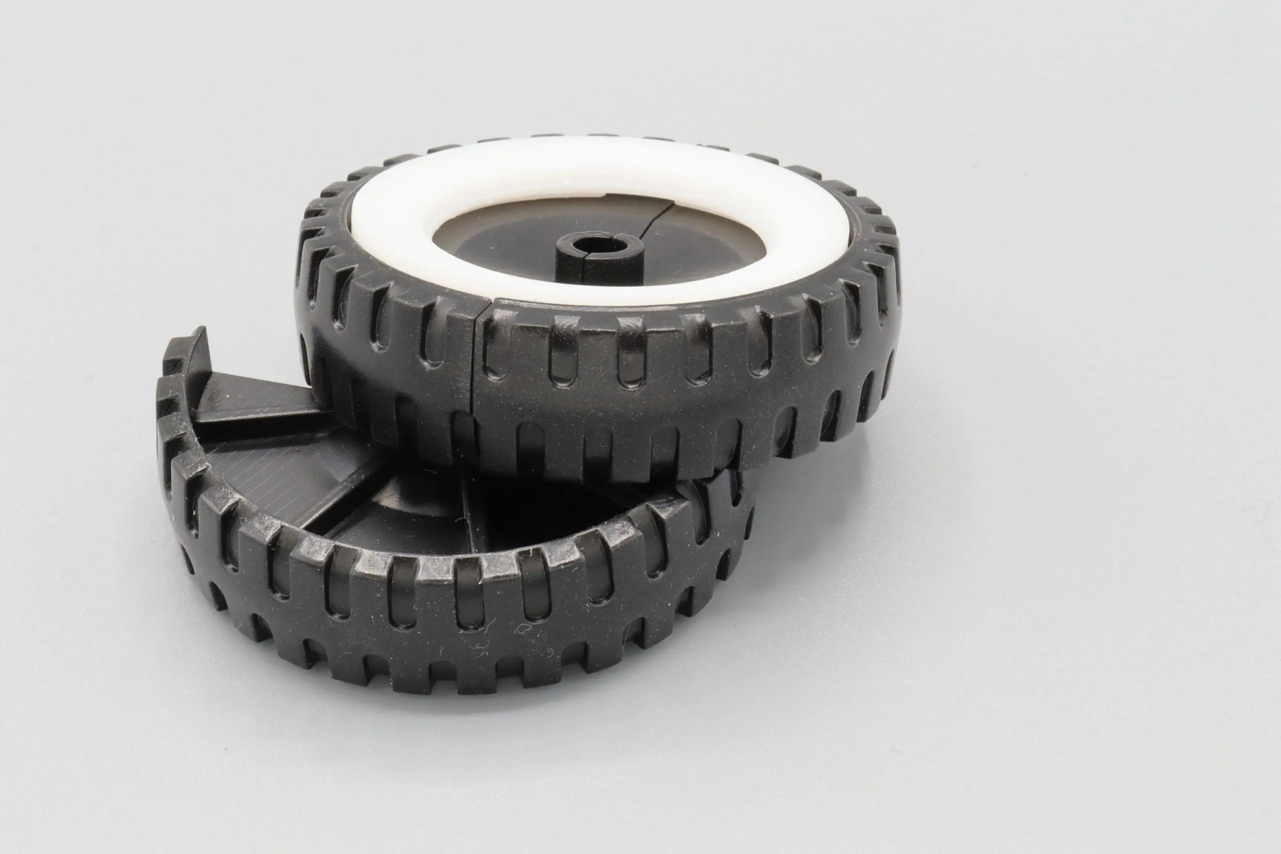 These rear wheels for the Ertl Loadstar are designed in two pieces to allow for easy replacement without the need to remove the original axles. The original truck featured solid plastic wheels with whitewall inserts and a stamped rim piece. The rear axles are often in good, original condition. This style wheel eliminates the need to cut the axle.